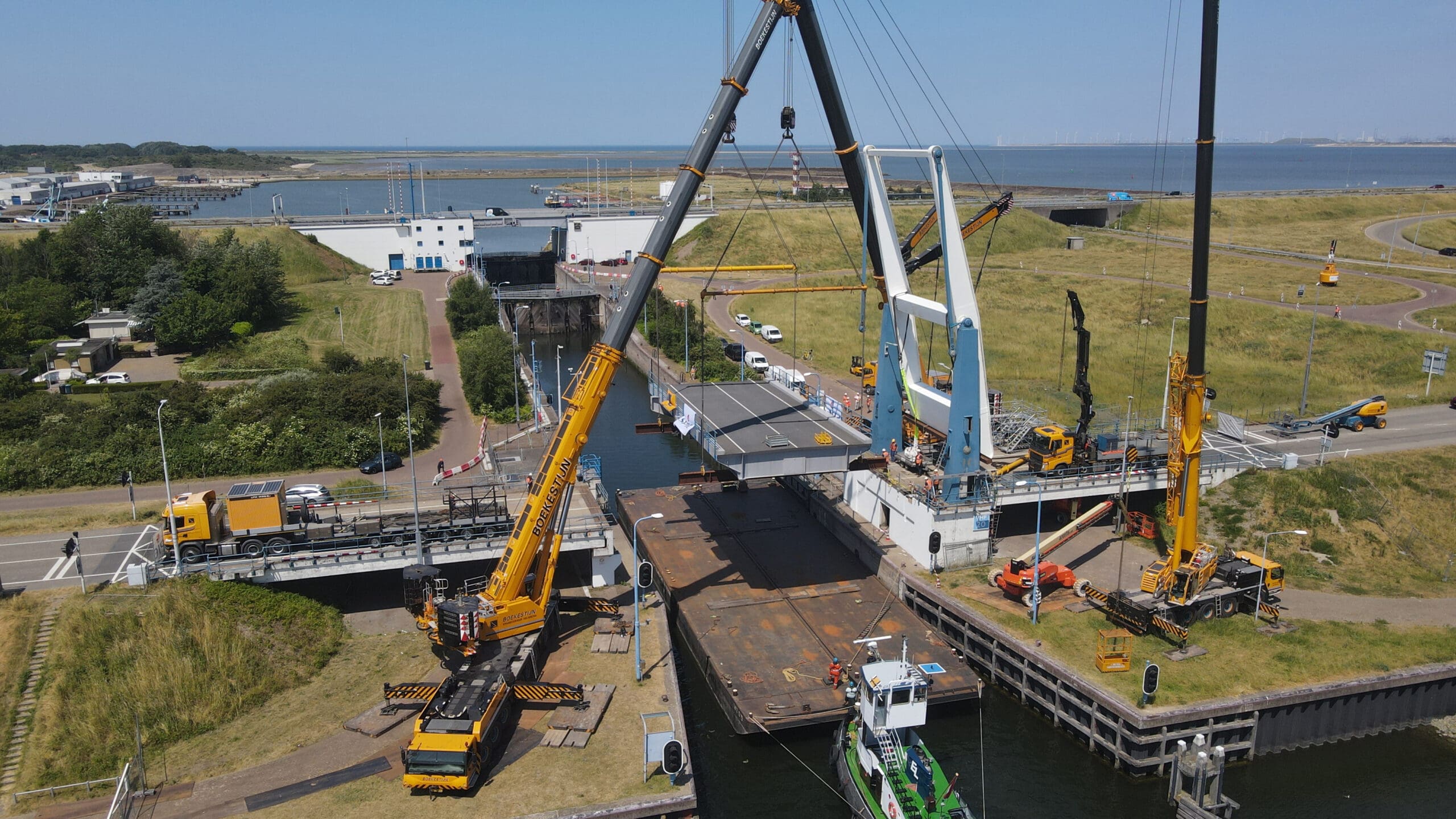 Afbeelding: Het hijsen van het brugdek bij de Goereesesluis in Stellendam met inzet van een 450-tons en een 800-tons kraan.